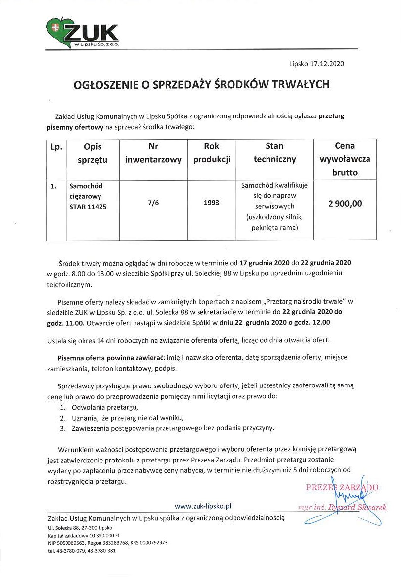 Zakład Usług Komunalnych w Lipsku sp. z o.o. ogłasza przetarg pisemny ofertowy na sprzedaż środka trwałego- samochód ciężarowy STAR 11425