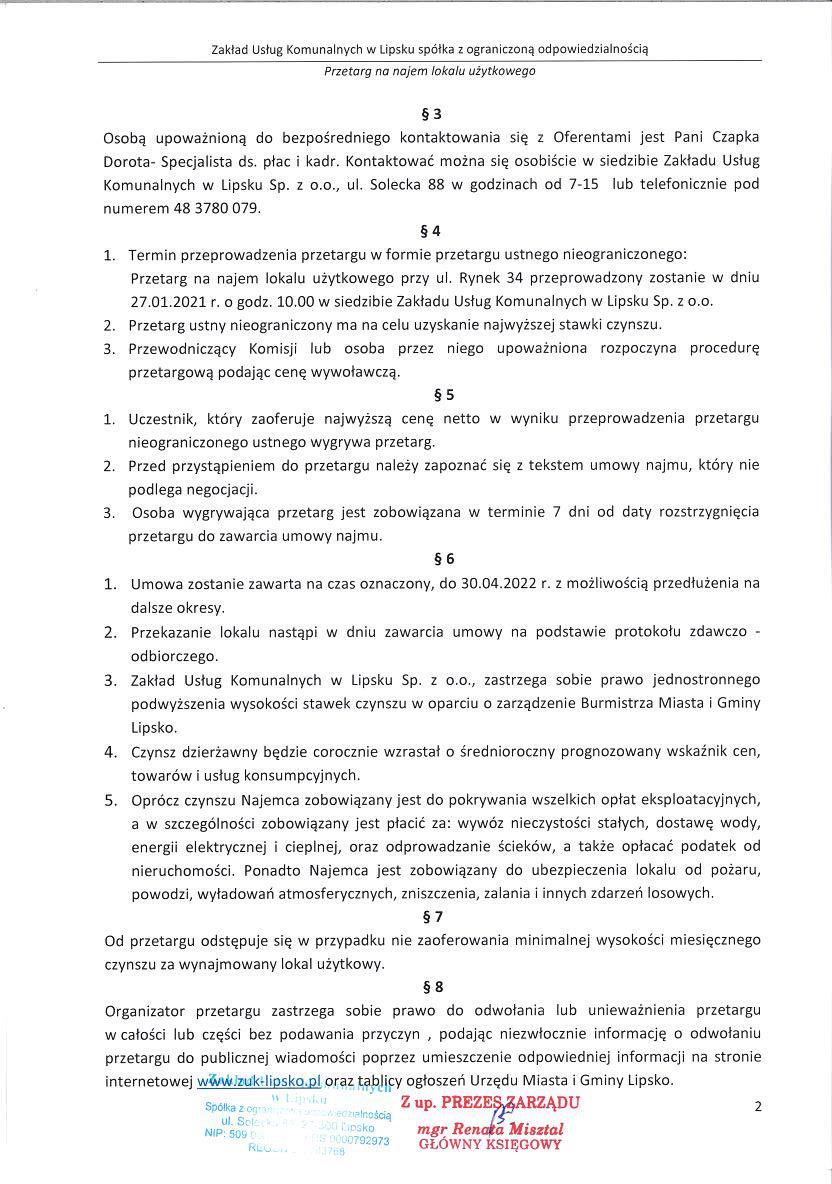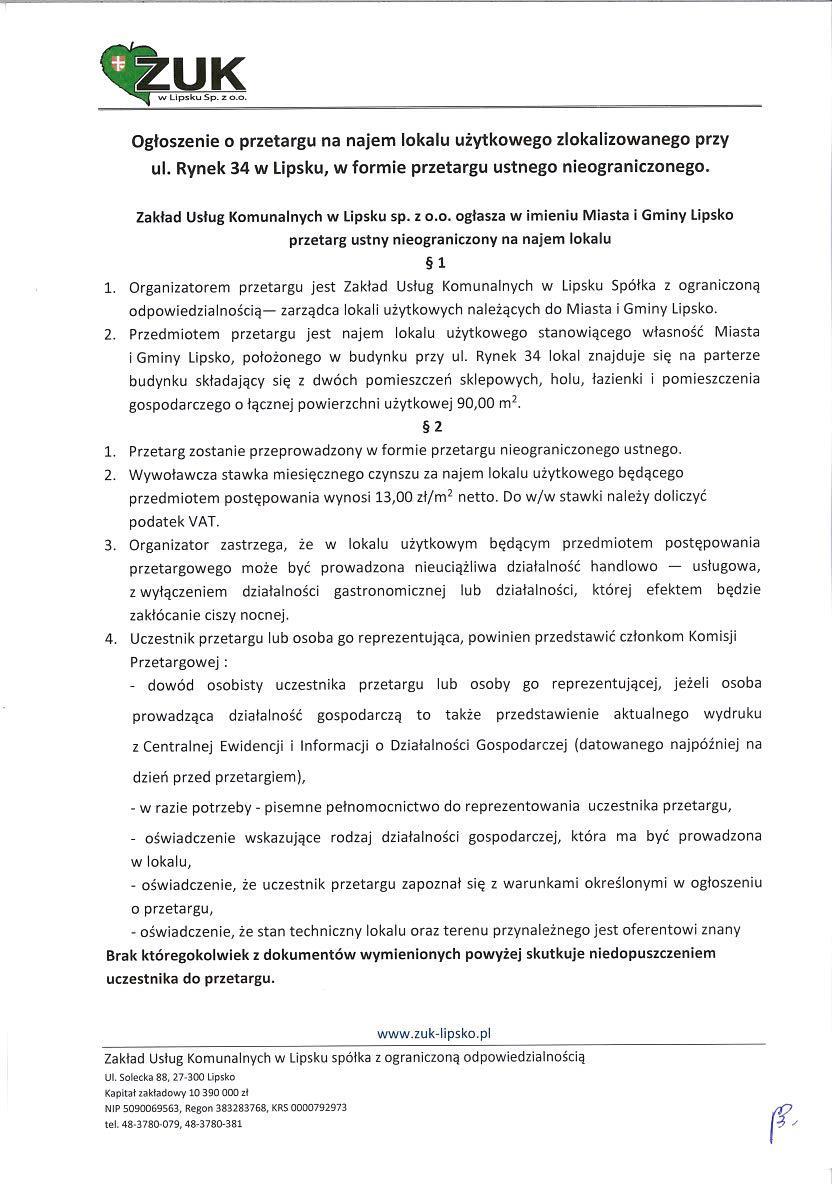 Zakład Usług Komunalnych w Lipsku sp. z o.o. ogłasza przetarg na najem lokalu użytkowego zlokalizowanego przy ul. Rynek 34 w Lipsku, w formie przetargu ustnego nieograniczonego.