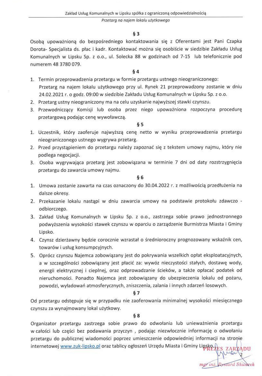 Zakład Usług Komunalnych w Lipsku sp. z o.o. ogłasza w imieniu Miasta i Gminy Lipsko przetarg ustny nieograniczony na najem lokalu użytkowego zlokalizowanego przy ul. Rynek 21 w Lipsku.