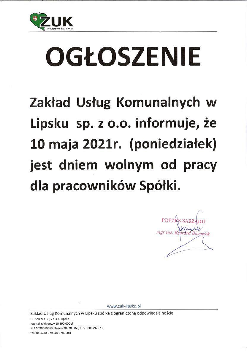 Zakład Usług Komunalnych w Lipsku sp. z o.o. informuje, że 10 maja 2021 r. (poniedziałek) jest dniem wolnym od pracy dla pracowników Spółki.