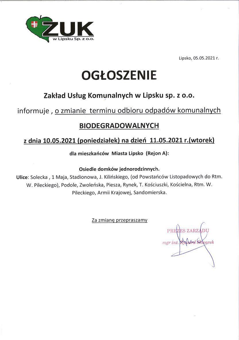 Ogłoszenie o zmianie terminu odbioru odpadów komunalnych