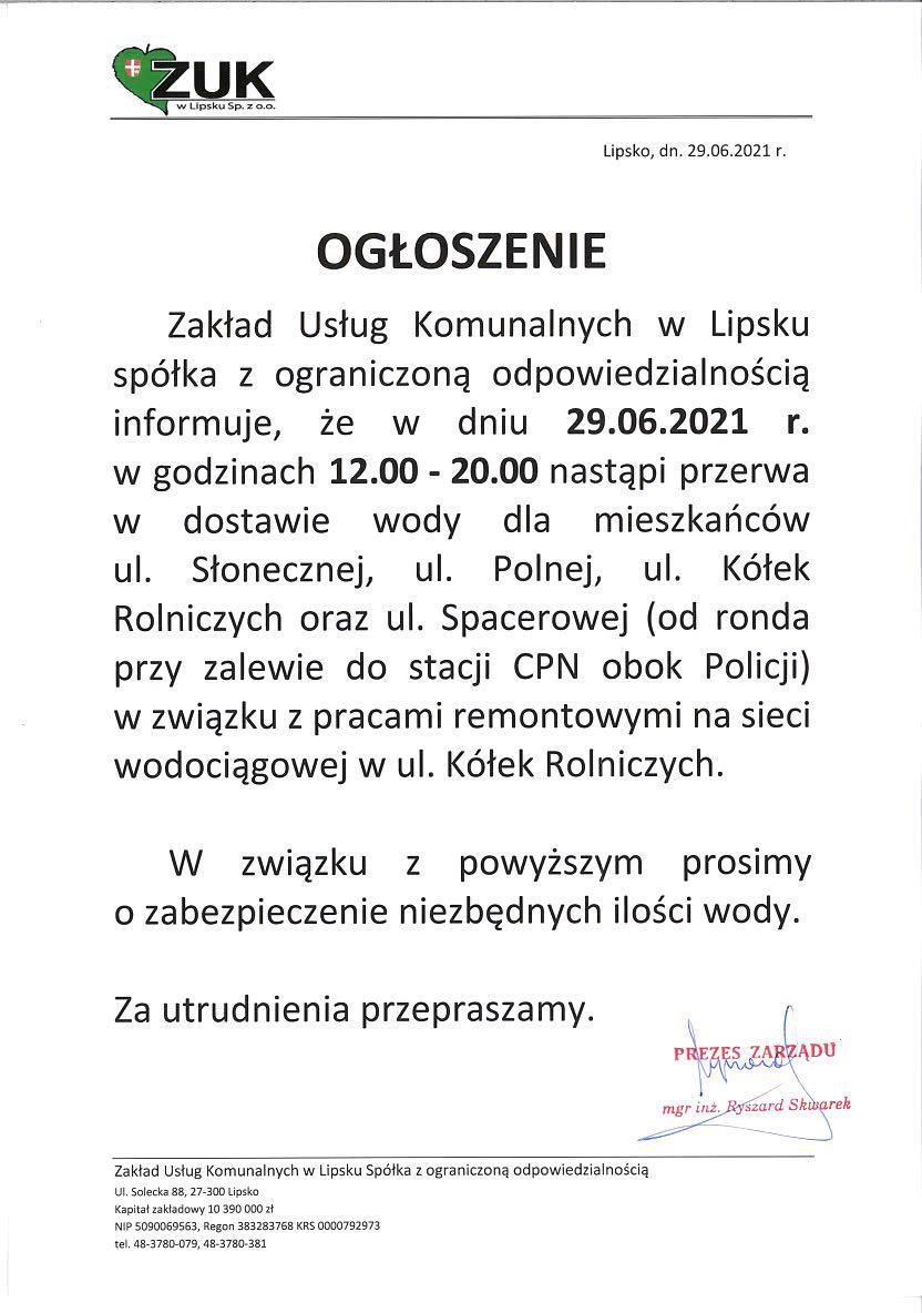 Zakład Usług Komunalnych w Lipsku spółka z ograniczoną odpowiedzialnością informuje, że w dniu 29.06.2021 r. w godzinach 12.00 - 20.00 nastąpi przerwa w dostawie wody dla mieszkańców ul. Słonecznej, ul. Polnej, ul. Kółek Rolniczych oraz ul. Spacerowej (od ronda przy zalewie do stacji CPN obok Policji) w związku z pracami remontowymi na sieci wodociągowej w ul. Kółek Rolniczych.