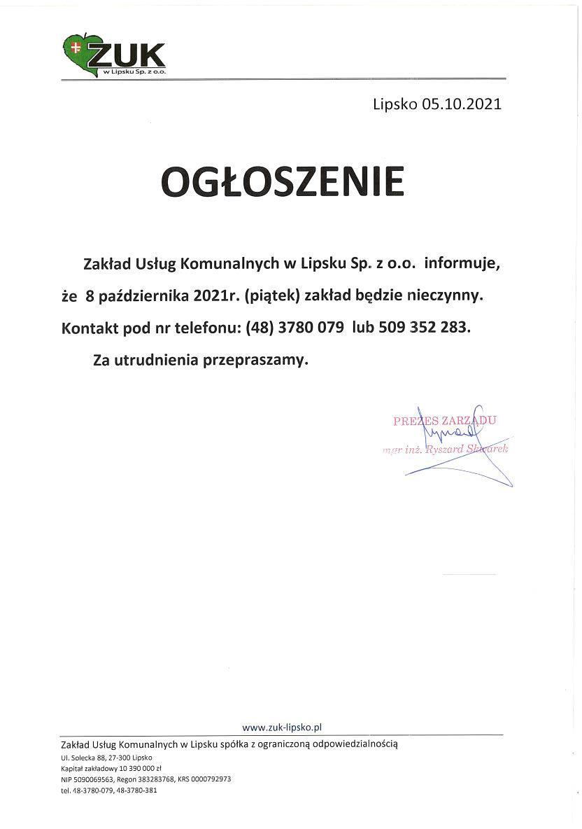 W piątek (08.10.2021) ZUK w Lipsku sp. z o.o. będzie nieczynny