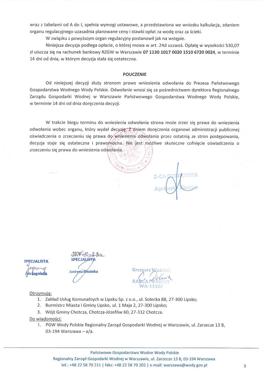 Na podstawie art. 24b ust. 1, 24c ust. 2 oraz 27a ust. 1 ustawy z dnia 7 czerwca 2001 r. O zbiorowym zaopatrzeniu w wodę i zbiorowym odprowadzaniu ścieków (t. j. Dz. U. z 2020 r., poz. 2028, zwanej dalej „uzzwoś"), w związku z art. 104 § 1 ustawy z dnia 14 czerwca 1960 r. — Kodeks postępowania administracyjnego (t. j. Dz. U. z 2021 r. poz. 735, zwanej dalej „Kpa"), po przeprowadzeniu postępowania administracyjnego z wniosku Zakładu Usług Komunalnych w Lipsku Sp. z o.o., ul. Solecka 88, 27-300 Lipsko z dnia 06 sierpnia 2021 roku (data wpływu: 09 sierpnia 2021 roku);