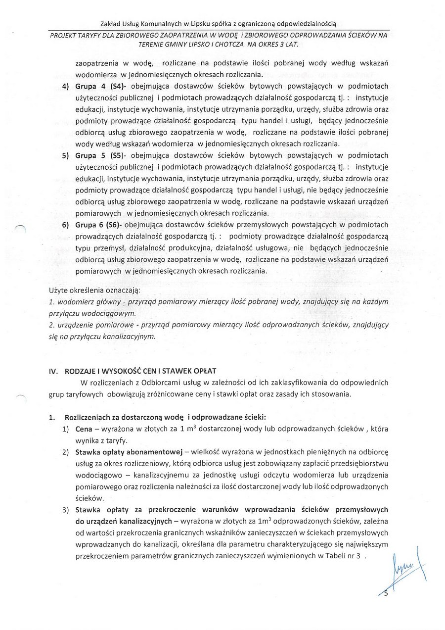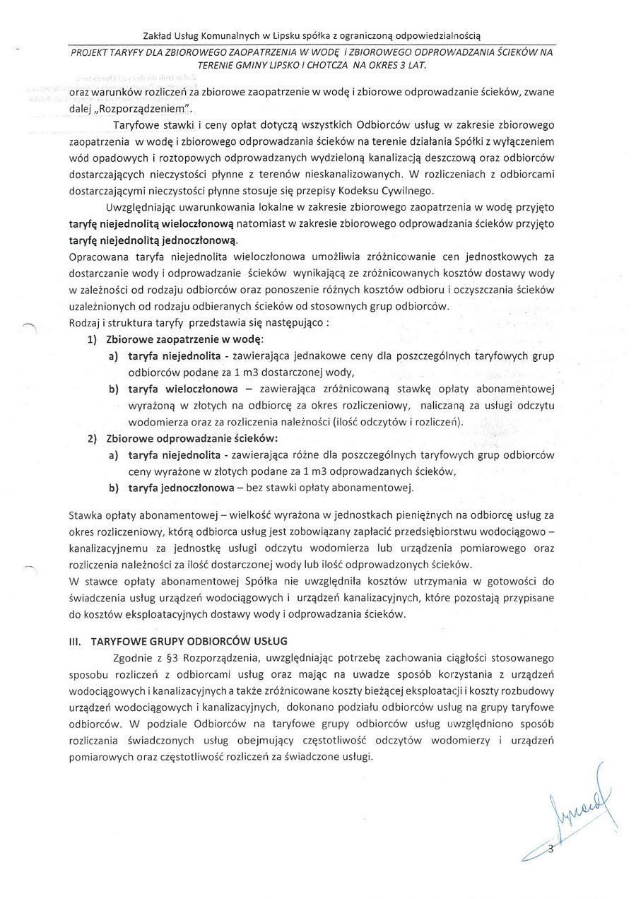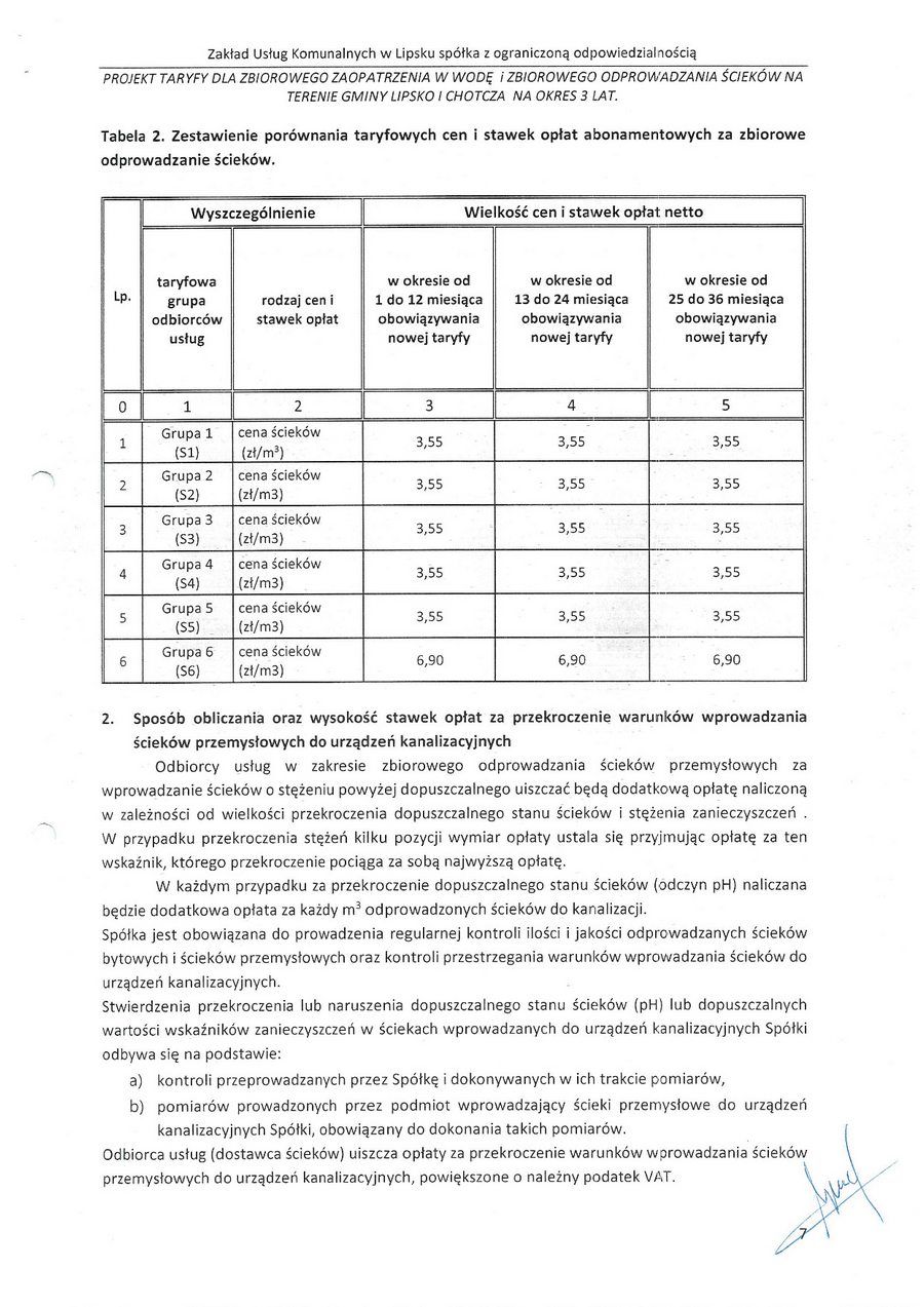 zatwierdzam taryfę za zbiorowe zaopatrzenie w wodę i zbiorowe oprowadzanie ścieków na terenie gminy Lipsko i za zbiorowe zaopatrzenie w wodę w części gminy Chotcza dla miejscowości: Białobrzegi, Baranów, Jarentowskie Pole oraz Kolonia Wola Solecka na okres 3 lat