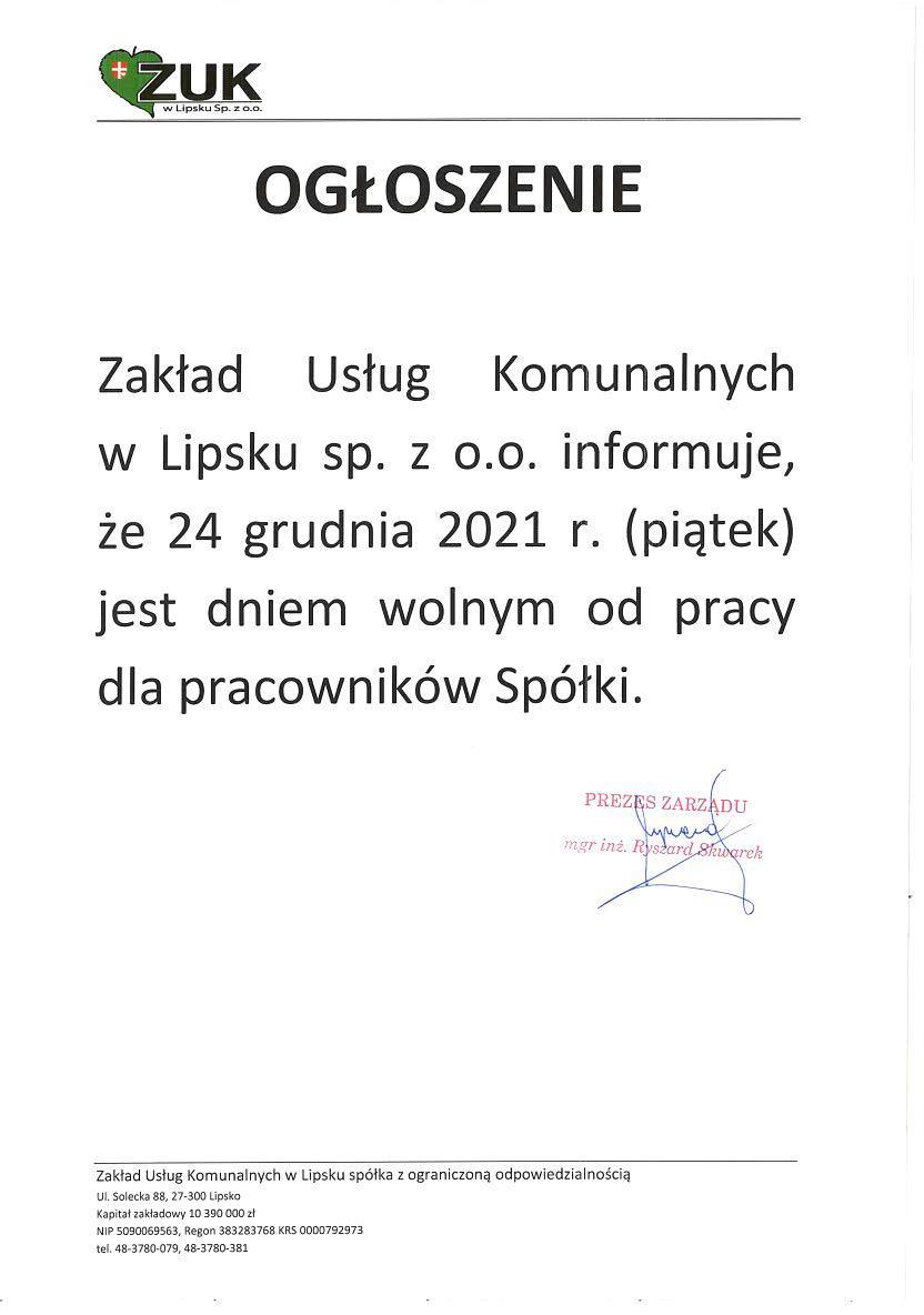 Zakład Usług Komunalnych w Lipsku sp. z o.o. informuje, że 24 grudnia 2021 r. (piątek) jest dniem wolnym od pracy dla pracowników Spółki.