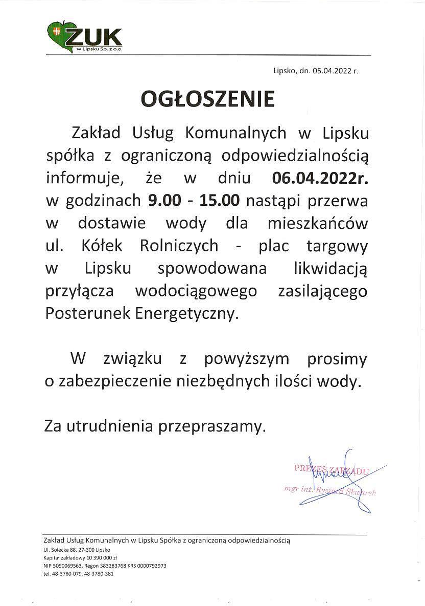 Zakład Usług Komunalnych w Lipsku spółka z ograniczoną odpowiedzialnością informuje, że w dniu 06.04.2022r. w godzinach 9.00 - 15.00 nastąpi przerwa w dostawie wody dla mieszkańców