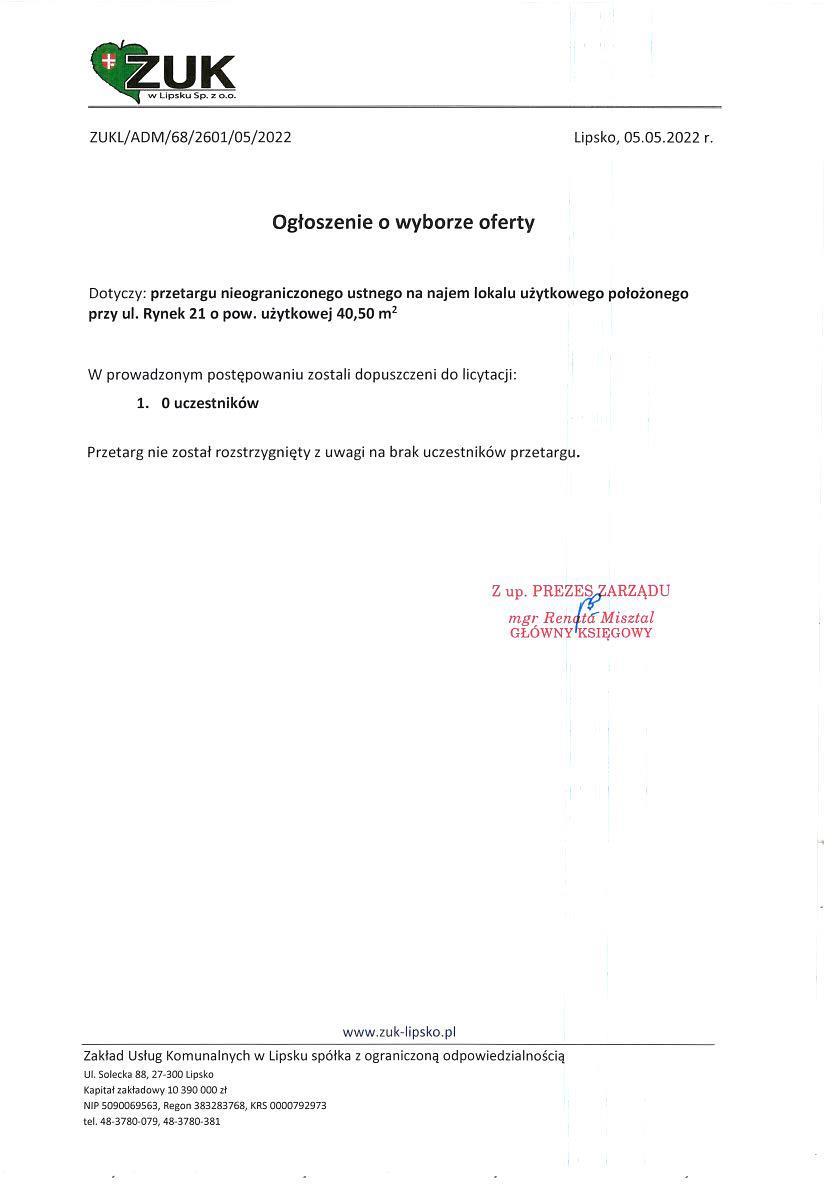 Ogłoszenie o wyborze oferty na najem lokalu użytkowego przy ul. Rynek 21 w Lipsku