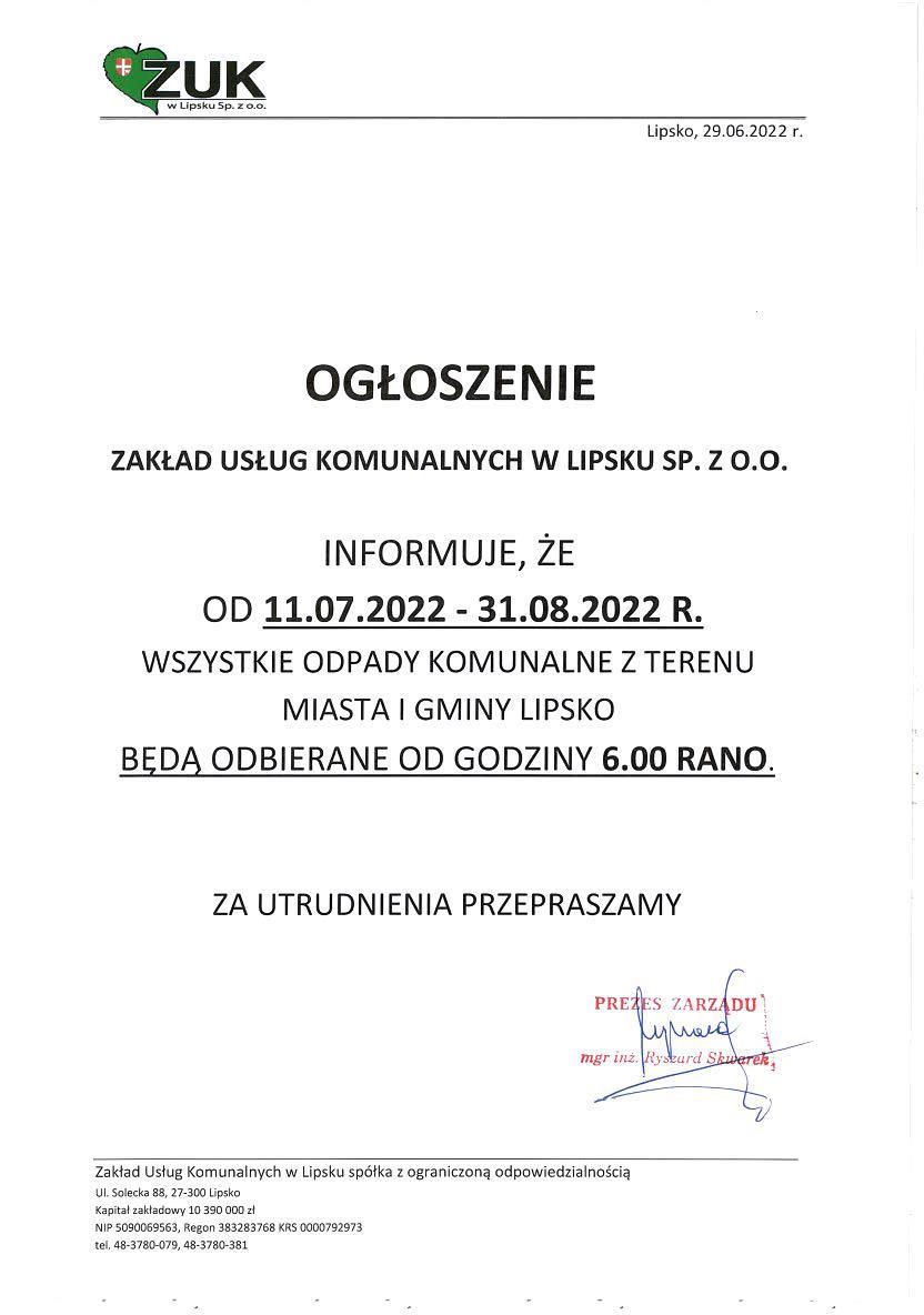 W dniach 11.07.2022 r. - 31.08.2022 r. odpady z terenu Miasta i Gminy Lipsko będą odbierane od godz. 6.00