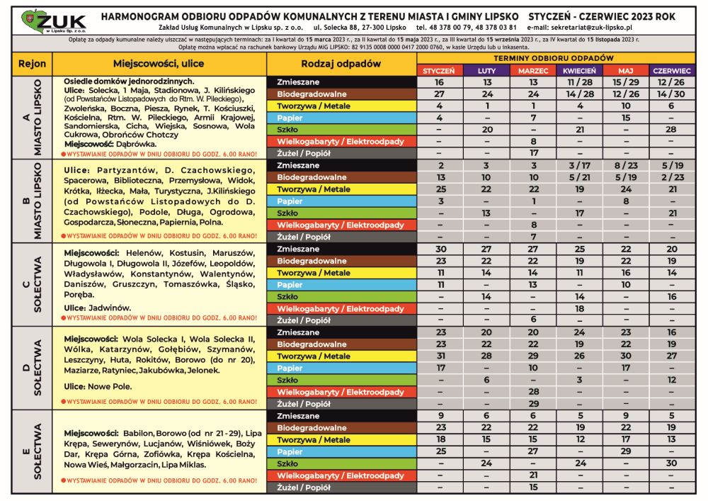 Przedstawiamy aktualny harmonogram odbioru odpadów komunalnych oraz zasady segregacji odpadów obowiązujący od stycznia do czerwca 2023 roku oraz zasady segregacji i informacje dla wspólnot.