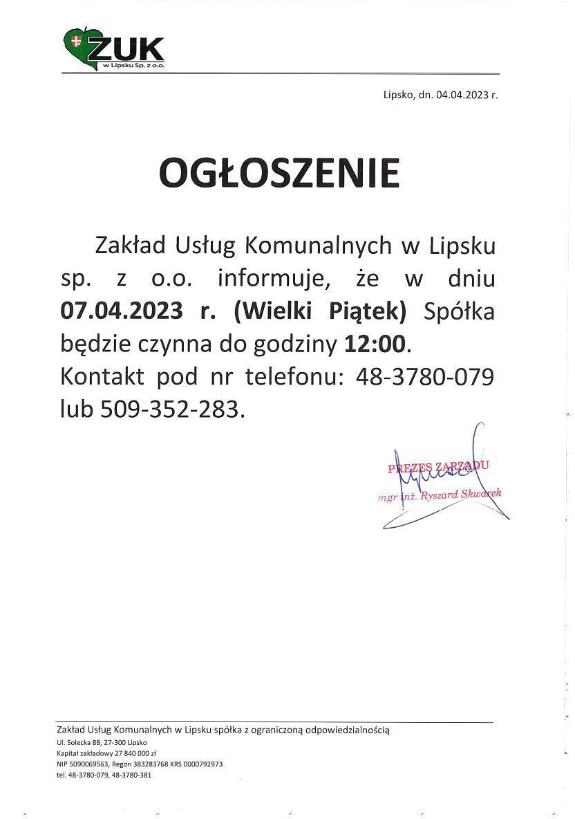 Zakład Usług Komunalnych w Lipsku sp. z o.o. informuje, że w dniu 07.04.2023 r. (Wielki Piątek) Spółka będzie czynna do godziny 12:00.