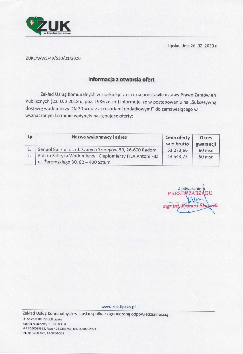 Informacja z otwarcia ofert na dostawę wodomierzy.