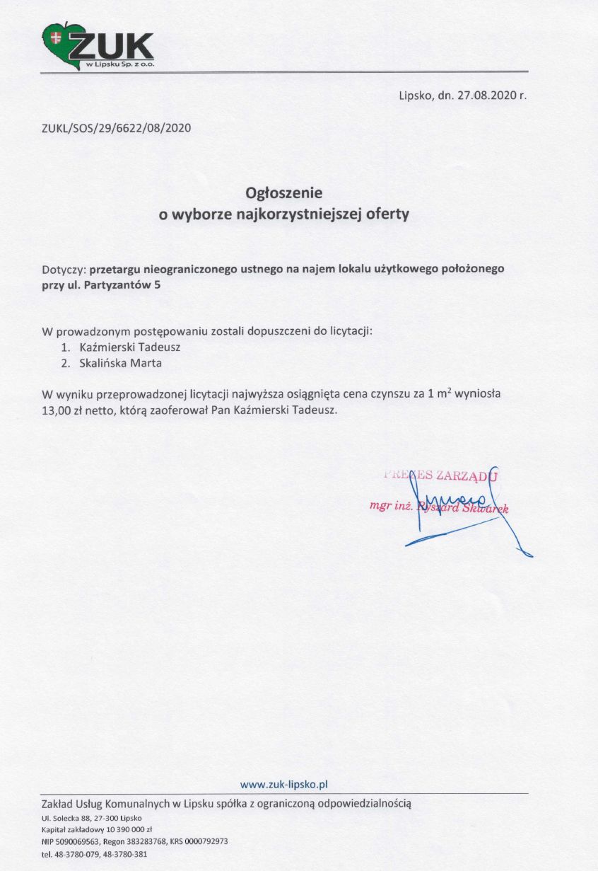 Ogłoszenie o wyborze najkorzystniejszej oferty. Dotyczy: przetargu nieograniczonego ustnego na najem lokalu użytkowego położonego przy ulicy Partyzantów 5.