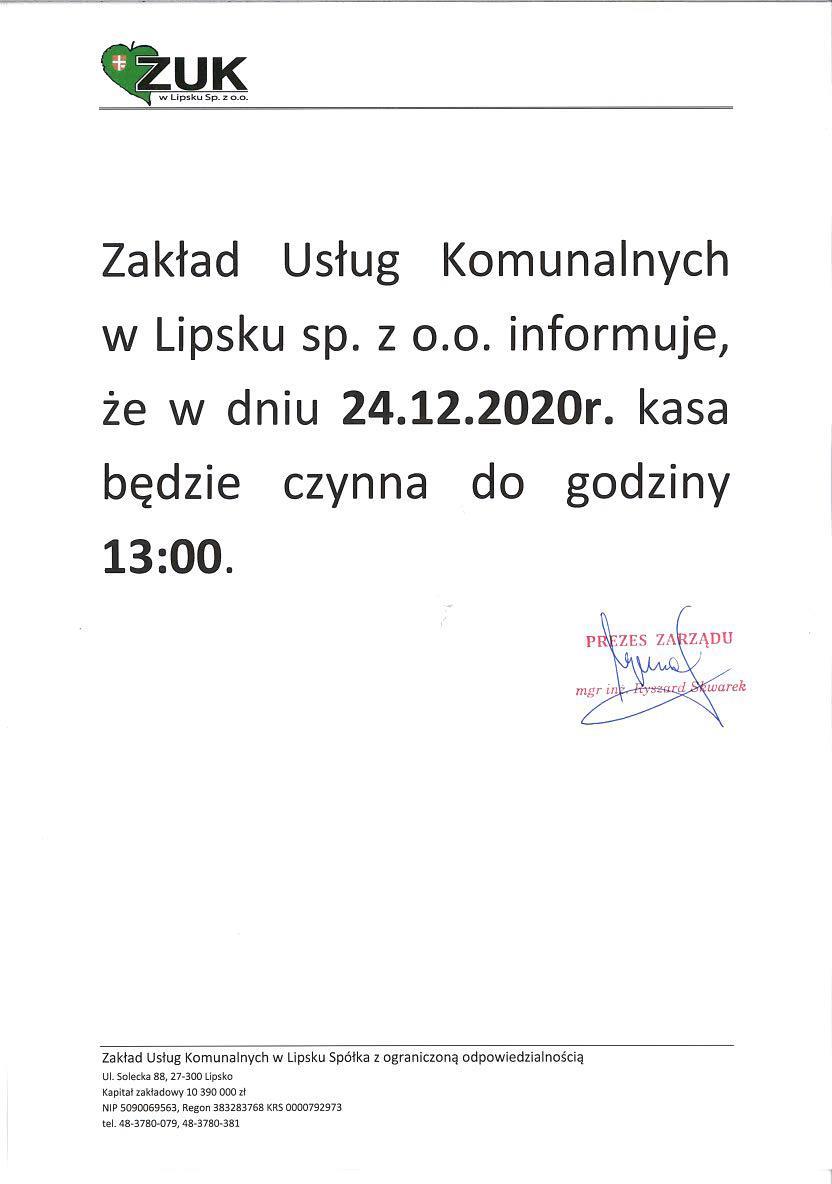 Informujemy, że w dniu 24.12.2020 r. kasa będzie czynna do godziny 13:00.