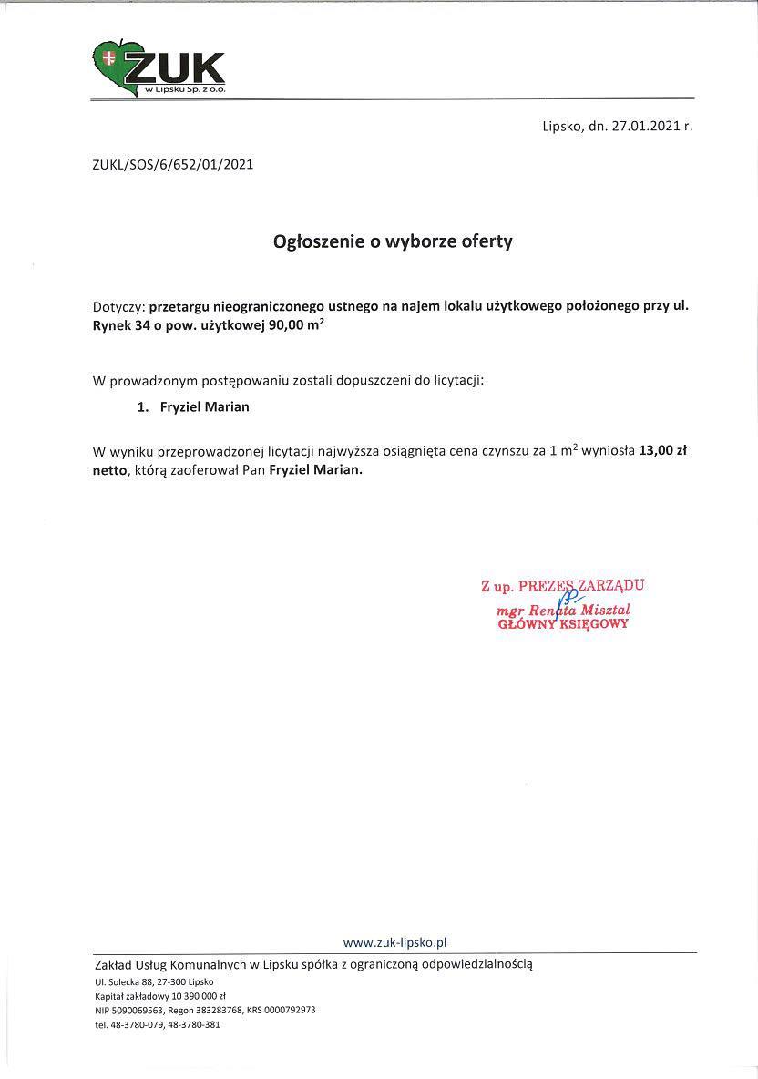 Ogłoszenie o wyborze oferty dot. przetargu nieograniczonego ustnego na najem lokalu użytkowego położonego przy ul. Rynek 34 o pow. użytkowej 90,00 m²