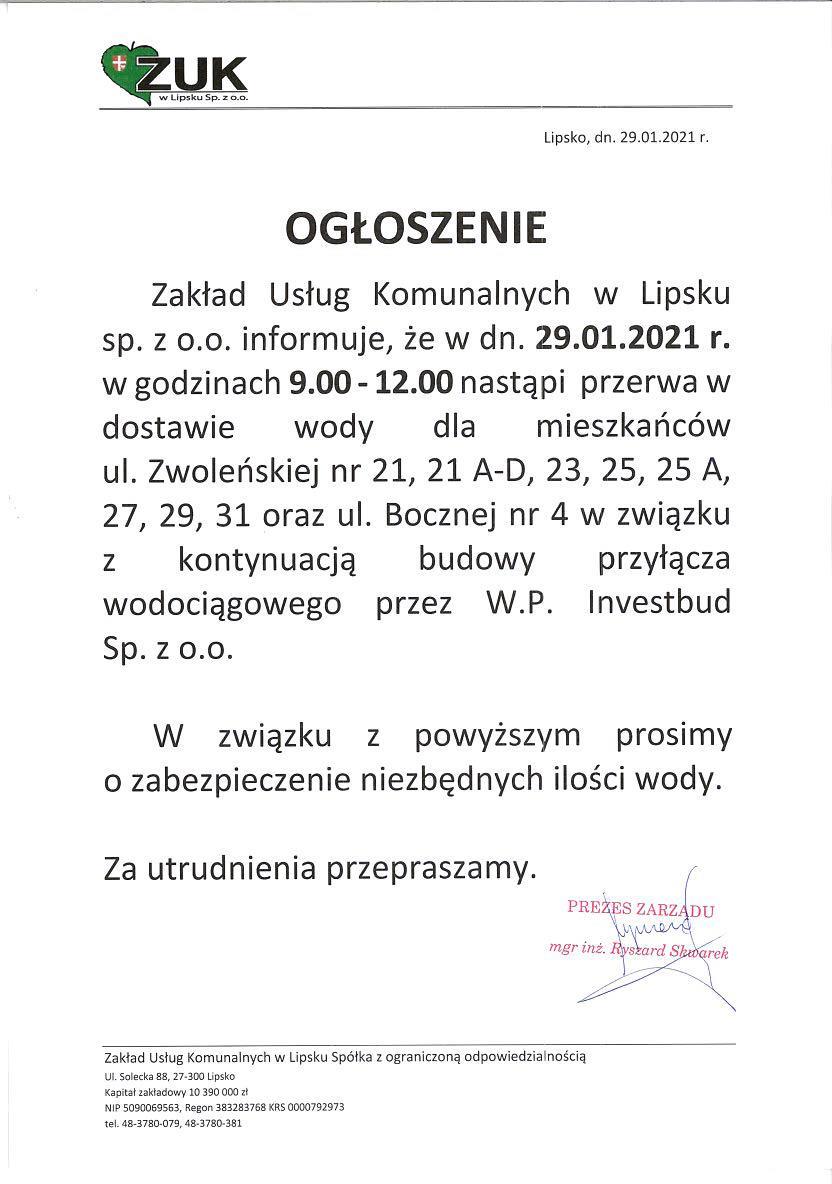 Informujemy, że w dn. 29.01.2021 r. w godz. 9.00-12.00 nastąpi przerwa w dostawie wody dla mieszkańców ul. Zwoleńskiej nr 21, 21 A-D, 23, 25, 25 A, 27, 29, 31 oraz ul. Bocznej nr 4 w związku z kontynuacją budowy przyłącza wodociągowego przez W.P. Investbud Sp. z o.o.
