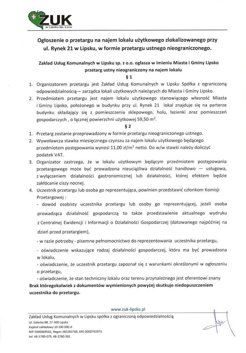 Zakład Usług Komunalnych w Lipsku sp. z o.o. ogłasza w imieniu Miasta i Gminy Lipsko przetarg ustny nieograniczony na najem lokalu użytkowego zlokalizowanego przy ul. Rynek 21 w Lipsku.