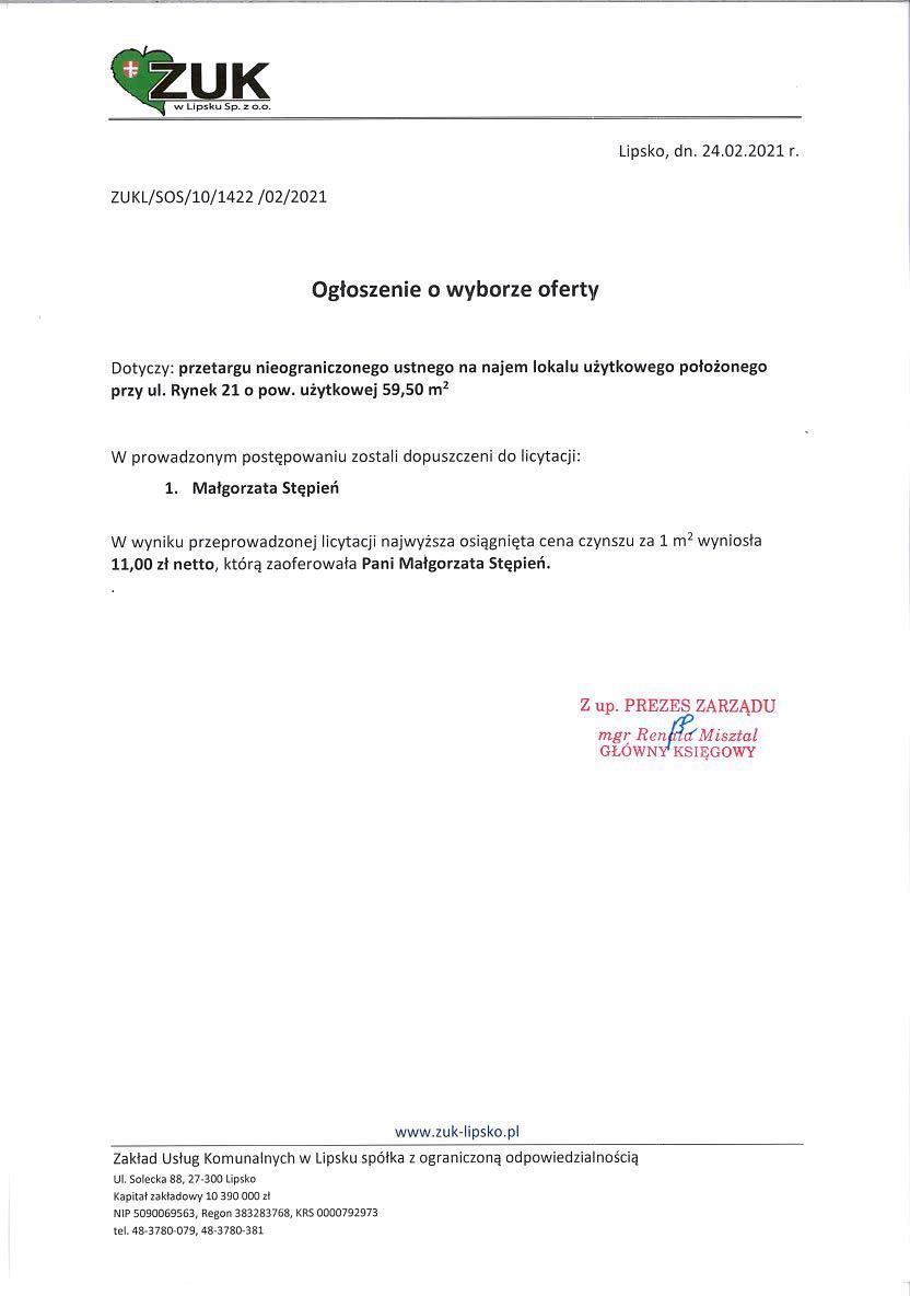 Ogłoszenie o wyborze oferty dot. przetargu nieograniczonego ustnego na najem lokalu użytkowego położonego przy ul. Rynek 21 o pow. użytkowej 59,50 m²