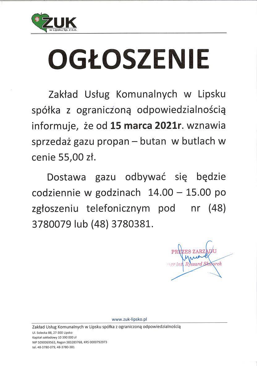 Zakład Usług Komunalnych w Lipsku sp. z o.o. informuje, że od 15 marca 2021 r. wznawia sprzedaż gazu propan- butan w butlach.