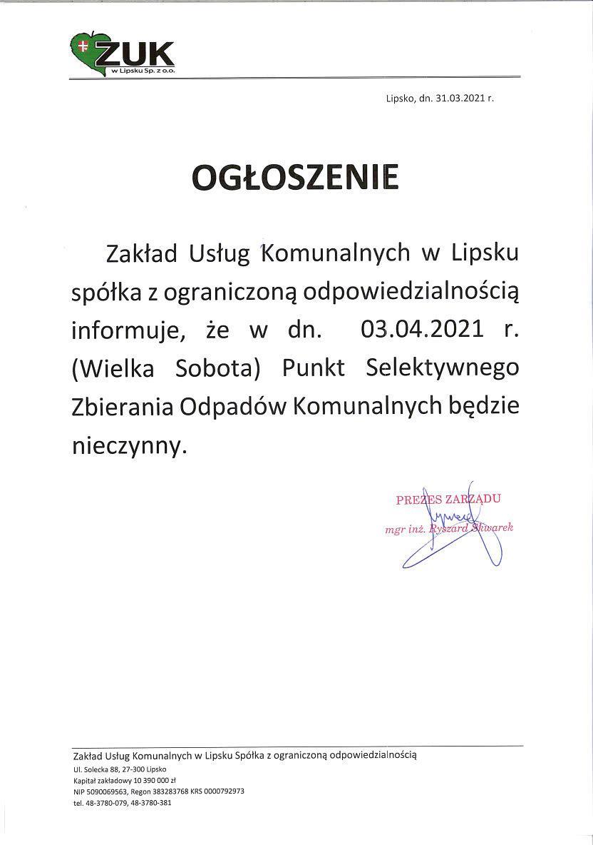 Informujemy, że w dn. 03.04.2021 r. (Wielka Sobota) Punkt Selektywnego Zbierania Odpadów Komunalnych będzie nieczynny.