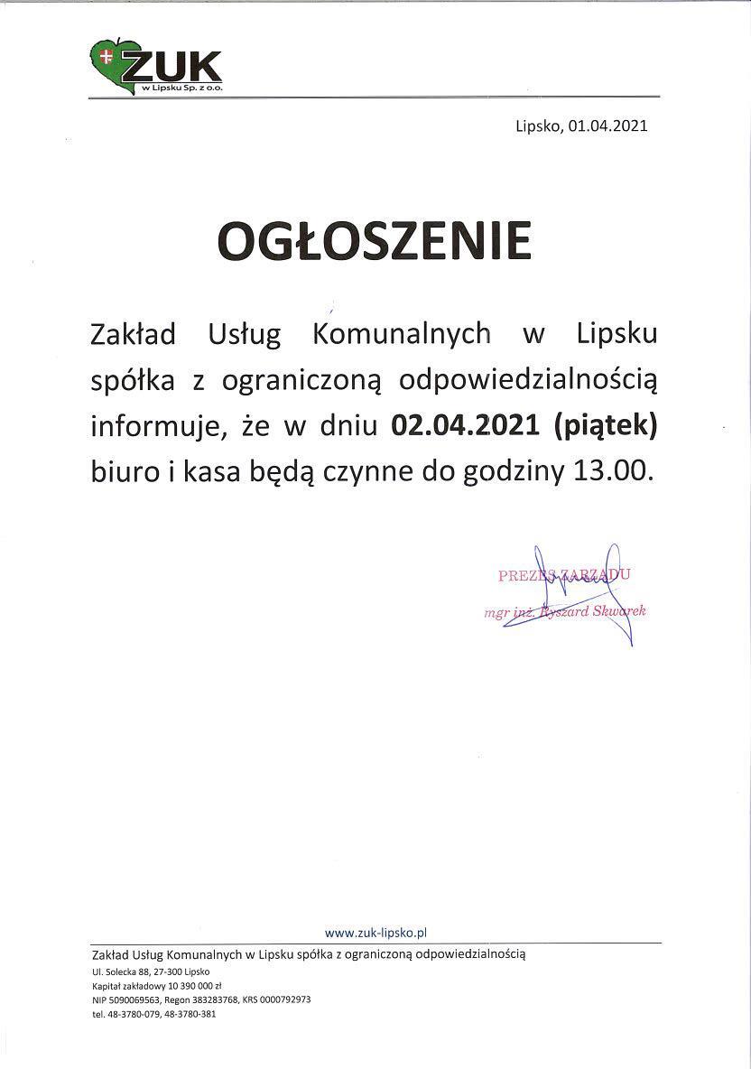 Zakład Usług Komunalnych w Lipsku spółka z ograniczoną odpowiedzialnością informuje, że w dniu 02.04.2021 (piątek) biuro i kasa będą czynne do godziny 13.00.