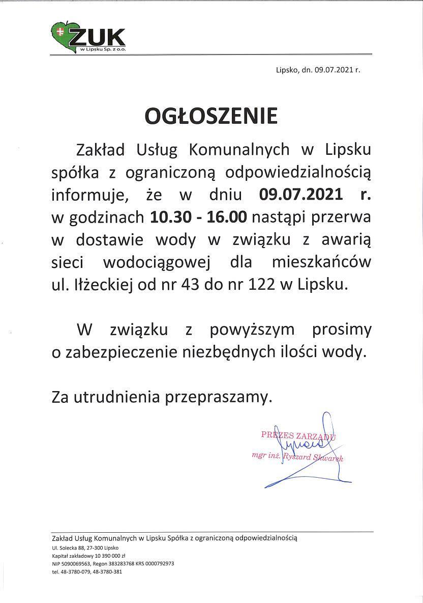 Zakład Usług Komunalnych w Lipsku spółka z ograniczoną odpowiedzialnością informuje, że w dniu 09.07.2021 r. w godzinach 10.30 - 16.00 nastąpi przerwa w dostawie wody w związku z awarią sieci wodociągowej dla mieszkańców ul. Iłżeckiej od nr 43 do nr 122 w Lipsku.