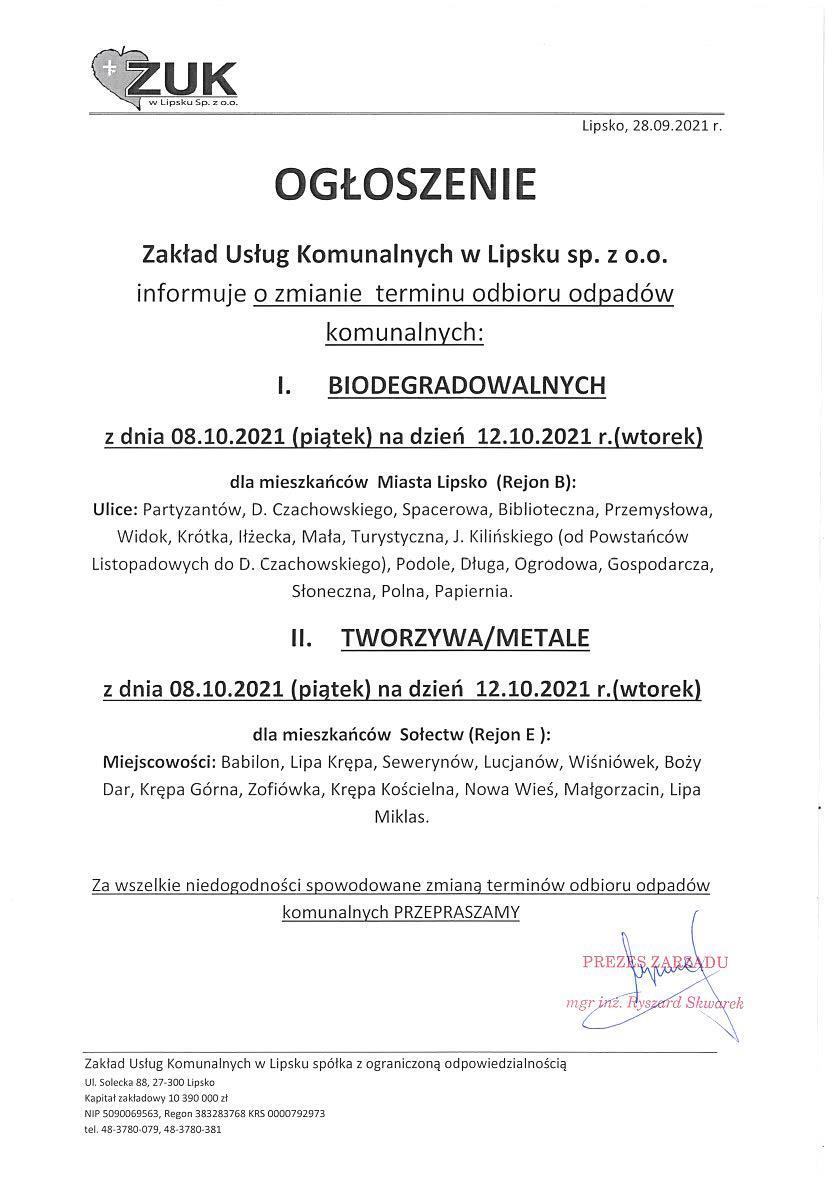 Ogłoszenie o zmianie terminu odbioru odpadów dot. rejonu B i E