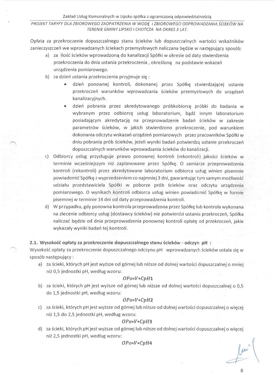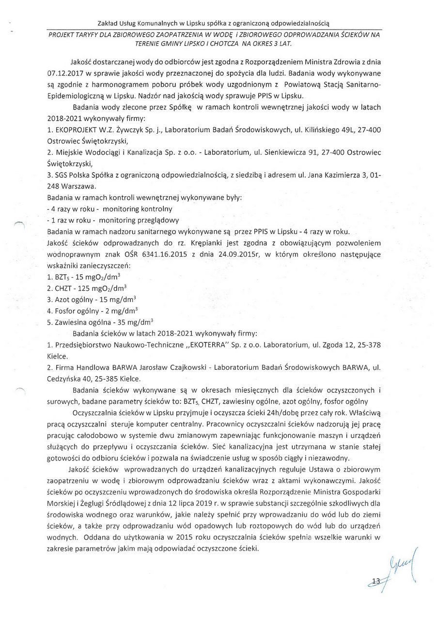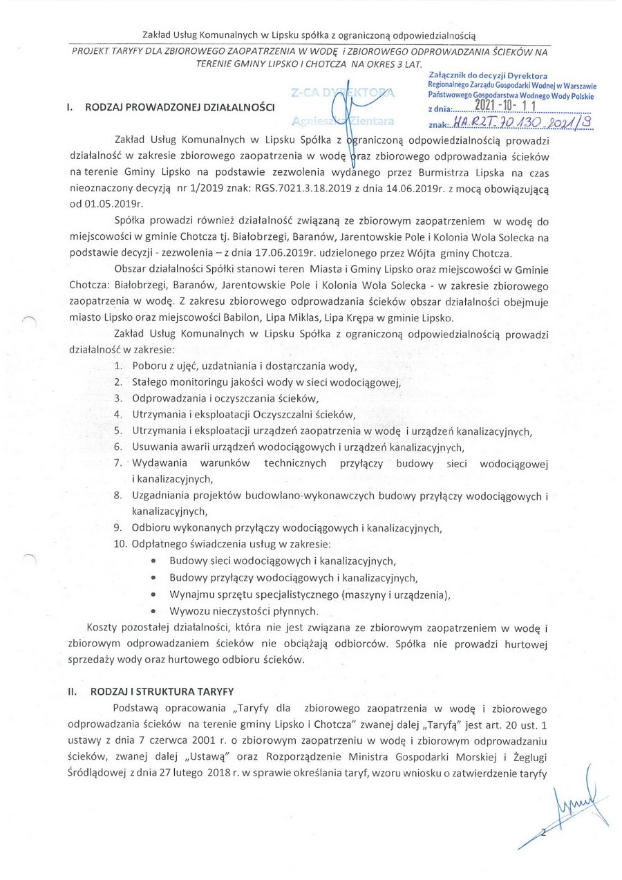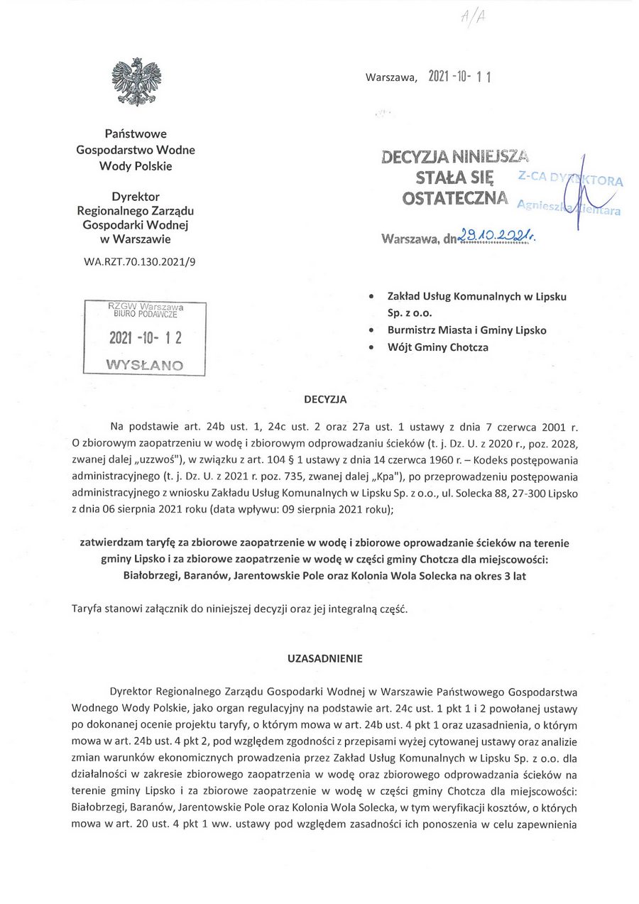 Na podstawie art. 24b ust. 1, 24c ust. 2 oraz 27a ust. 1 ustawy z dnia 7 czerwca 2001 r. O zbiorowym zaopatrzeniu w wodę i zbiorowym odprowadzaniu ścieków (t. j. Dz. U. z 2020 r., poz. 2028, zwanej dalej „uzzwoś"), w związku z art. 104 § 1 ustawy z dnia 14 czerwca 1960 r. — Kodeks postępowania administracyjnego (t. j. Dz. U. z 2021 r. poz. 735, zwanej dalej „Kpa"), po przeprowadzeniu postępowania administracyjnego z wniosku Zakładu Usług Komunalnych w Lipsku Sp. z o.o., ul. Solecka 88, 27-300 Lipsko z dnia 06 sierpnia 2021 roku (data wpływu: 09 sierpnia 2021 roku);