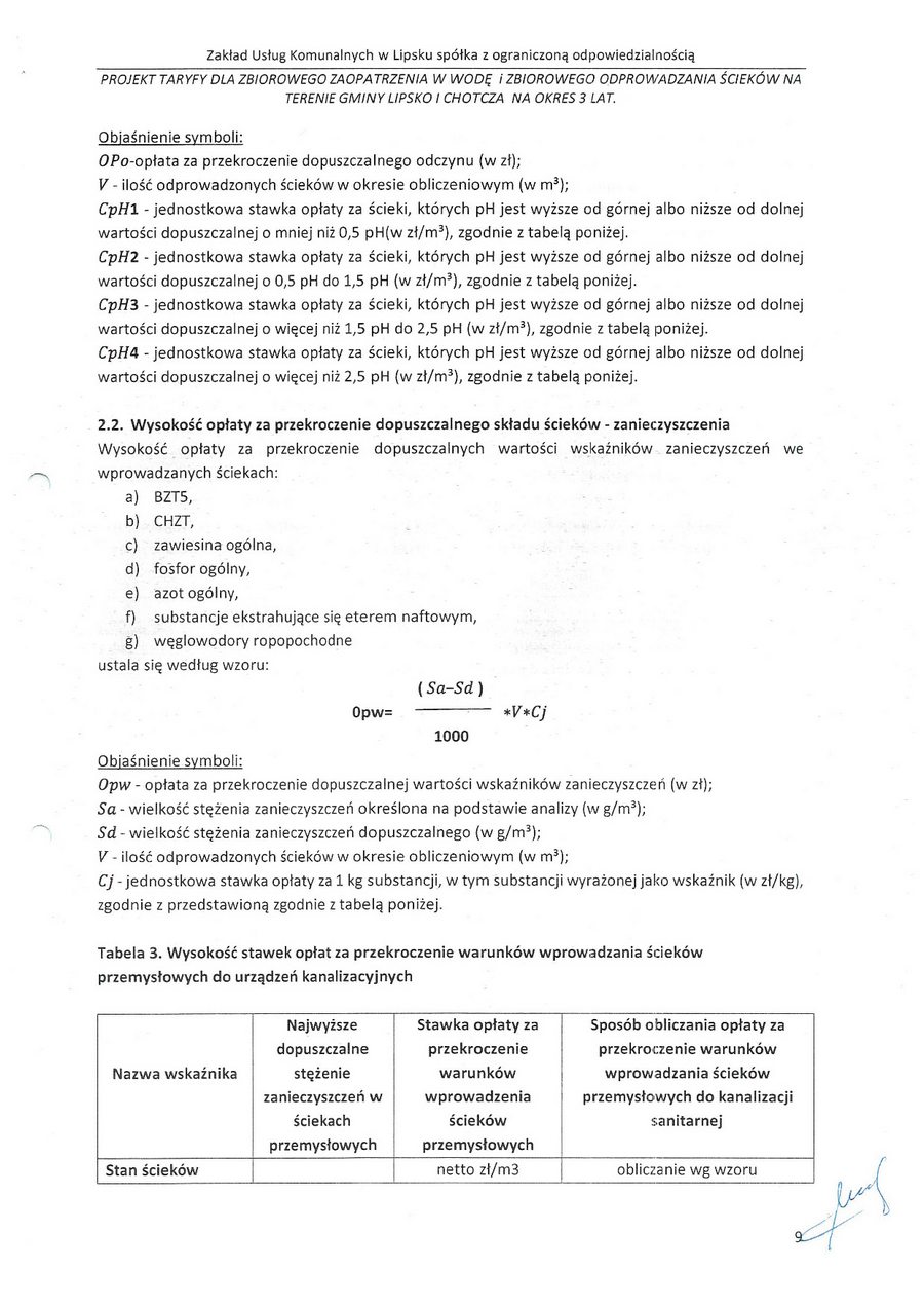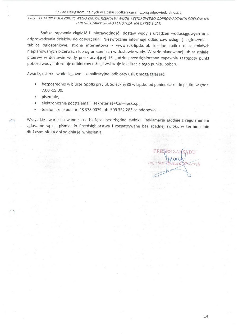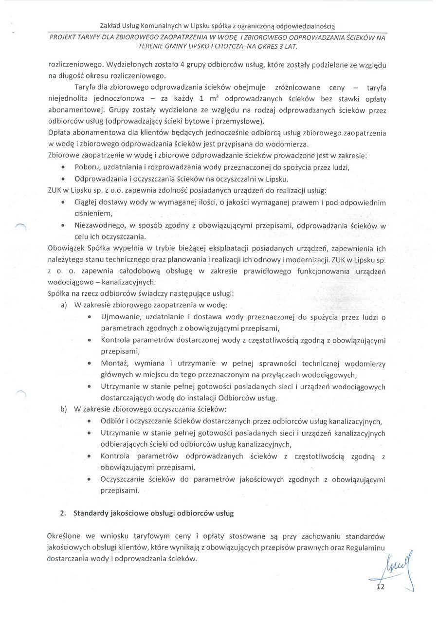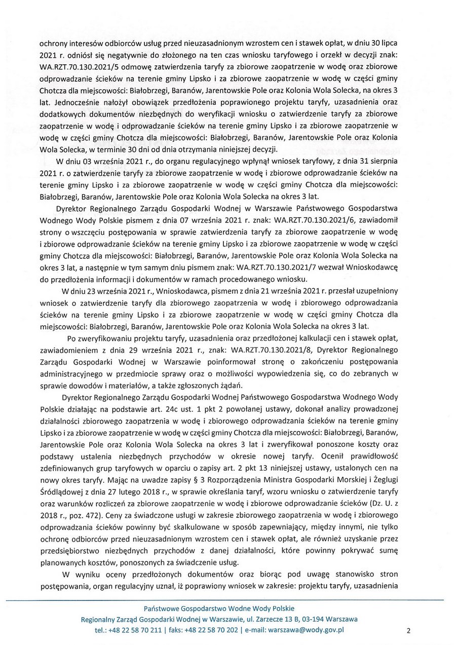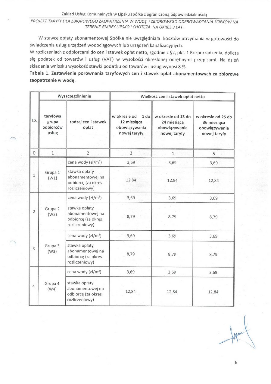 zatwierdzam taryfę za zbiorowe zaopatrzenie w wodę i zbiorowe oprowadzanie ścieków na terenie gminy Lipsko i za zbiorowe zaopatrzenie w wodę w części gminy Chotcza dla miejscowości: Białobrzegi, Baranów, Jarentowskie Pole oraz Kolonia Wola Solecka na okres 3 lat