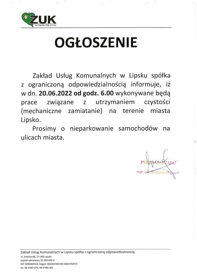 Ogłoszenie o mechanicznym zamiataniu ulic na terenie miasta Lipsko