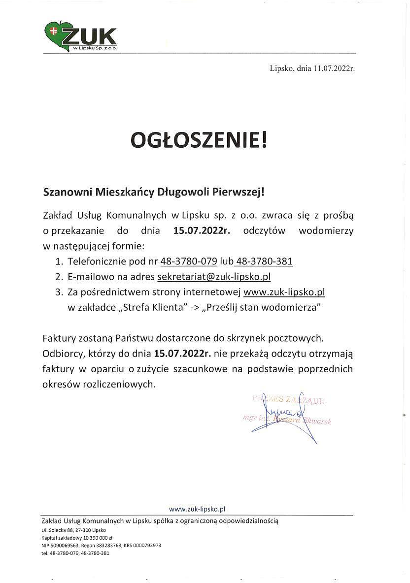 Ogłoszenie o przekazaniu odczytów wodomierzy dot. miejscowości Długowola Pierwsza