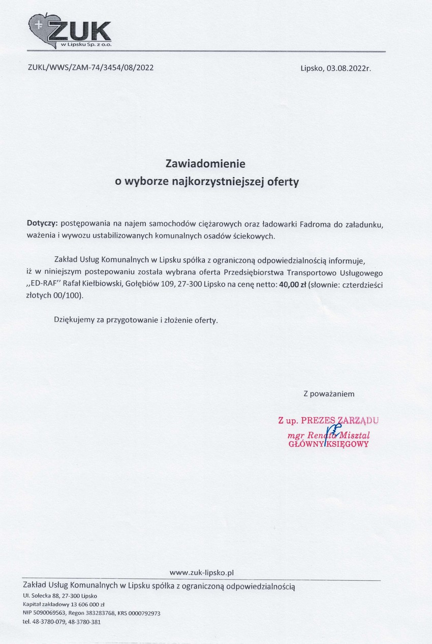 Zawiadomienie o wyborze oferty na najem samochodów ciężarowych oraz ładowarki typu Fadroma do wywozu osadów ściekowych z oczyszczalni ścieków w Lipsku.
