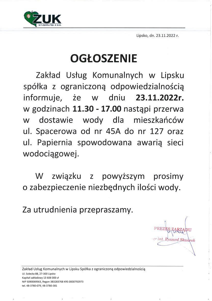Zakład Usług Komunalnych w Lipsku spółka z ograniczoną odpowiedzialnością informuje, że w dniu 23.11.2022r. w godzinach 11.30 - 17.00 nastąpi przerwa w dostawie wody dla mieszkańców