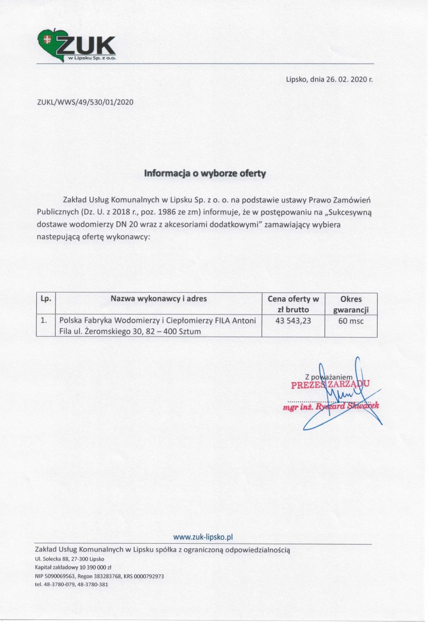 Informacja z otwarcia ofert na dostawę wodomierzy.